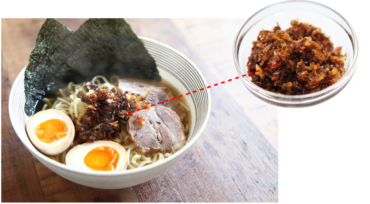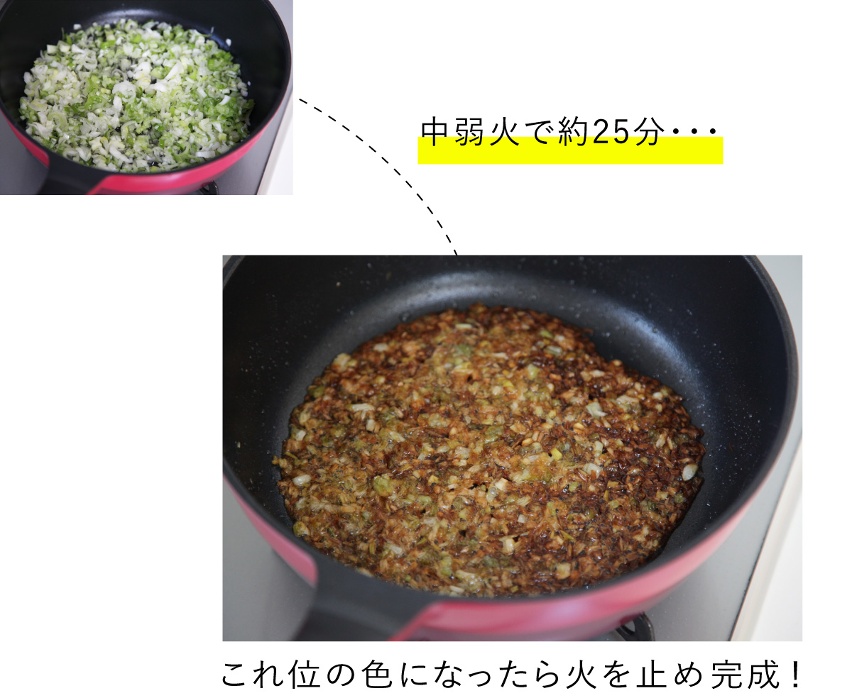 この「焦がしネギ」、食べるときにスープに溶かすと、香ばしいネギの香りがぽわ〜んと広がり、一流のスープに早変わり。つくり方は、ネギのみじん切りを、焦げ色がつくまでじっくり炒めるだけです。