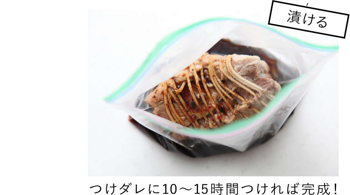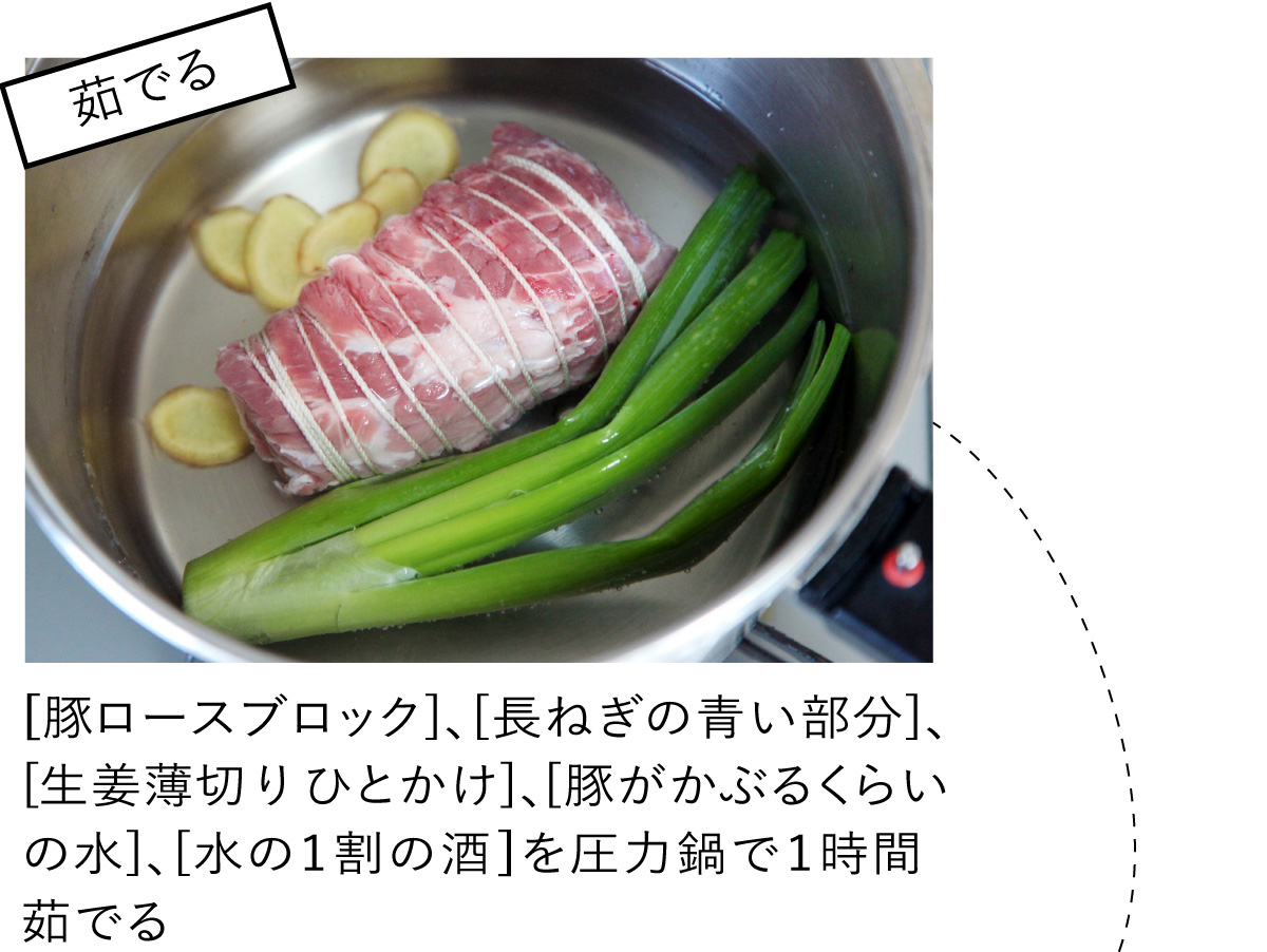 煮卵と同じつけダレで、本格的なチャーシューもつくれるんです。豚を柔らか〜くするには、圧力鍋で1時間。普通の鍋なら3時間。少し時間はかかりますが、工程は2ステップだけ。チャレンジする価値ありですよ!