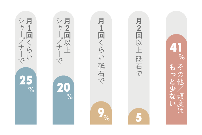 以前メルマガで、包丁の研ぎ直しの頻度を伺ったところ、大多数の方が「月に1回かそれ未満」という結果になりました。専門家の推奨は、「月に2回、砥石で」なのですが、ご家庭ではなかなかハードルが高いようです。