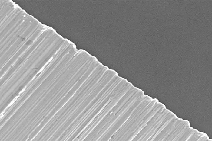 まずはじめに。よく切れる包丁の刃は、角度が小さく鋭利に仕上がっています。また、顕微鏡で見ると刃先にはミクロのギザギザがあり、この“ギザ刃”が食材への入り込みを助けています。
