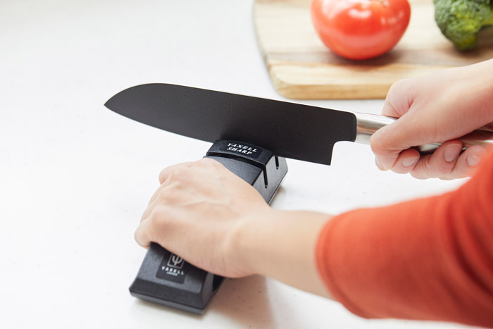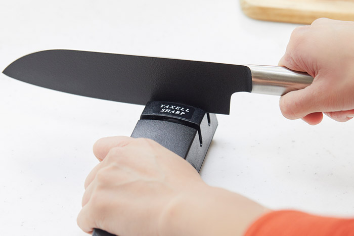 手で引いて使うタイプの簡易シャープナーは、刃の表面を整え、手軽に“ギザ刃”を復活させることができます。刃の角度を細かく調整することはできませんが、“ギザ刃”により食材への食い込みが良くなり、切れ味を手早く戻すことができます。